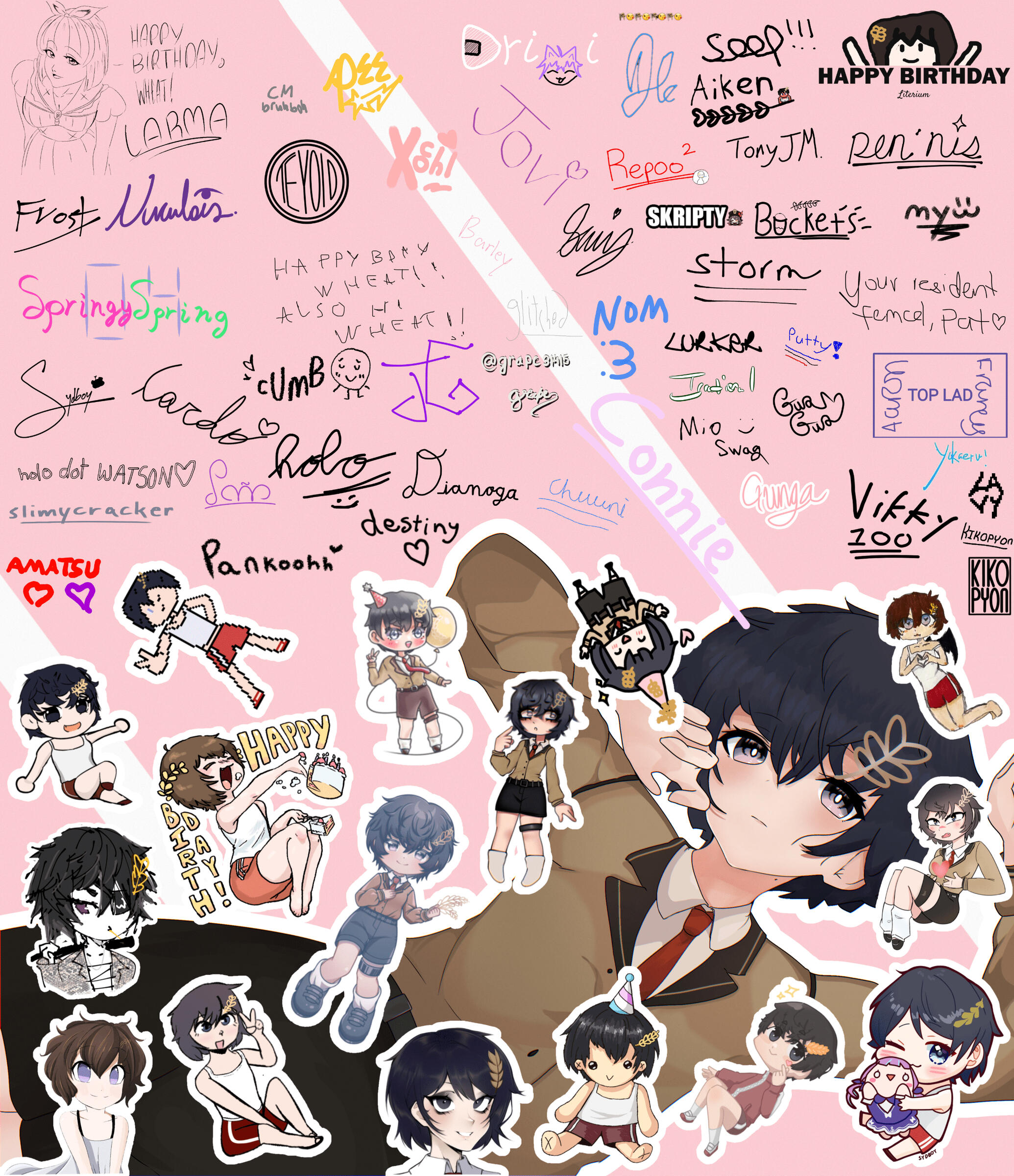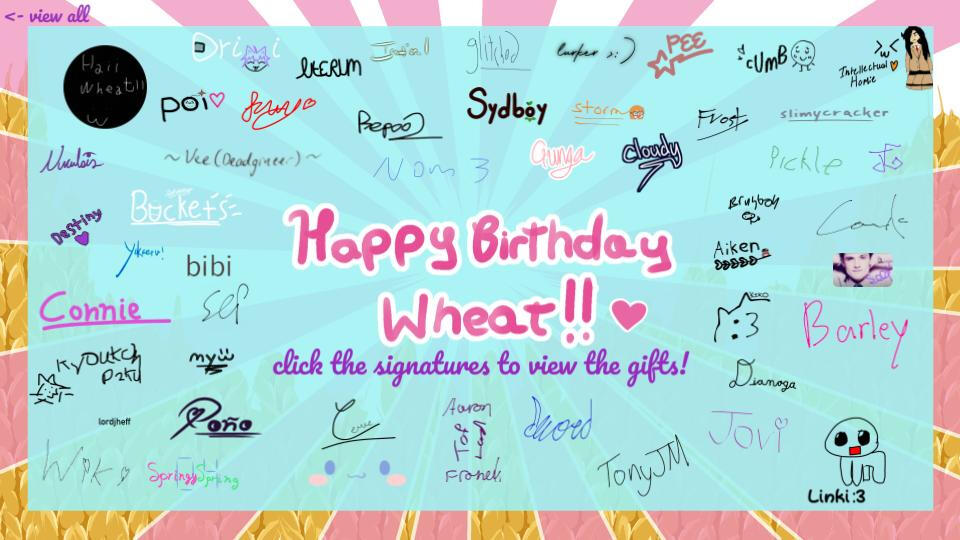 a similar concept to the surprise 2022 collage, except the gifts are shown by clicking or tapping on the signatures. there is a huge variety of gifts, which include art, music, memes, thoughts, and more. click or tap on the picture below to be redirected to the main image so you can interact with the signatures!